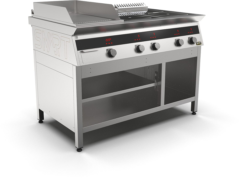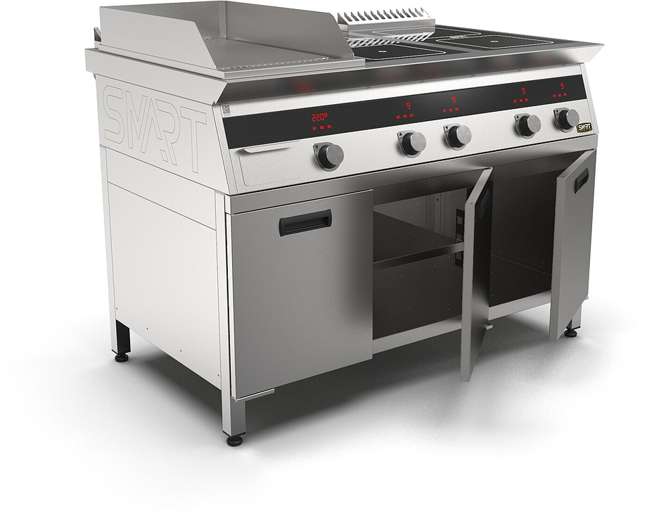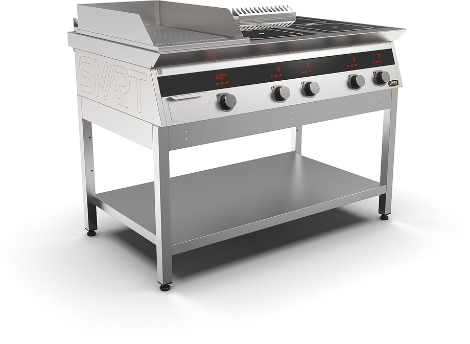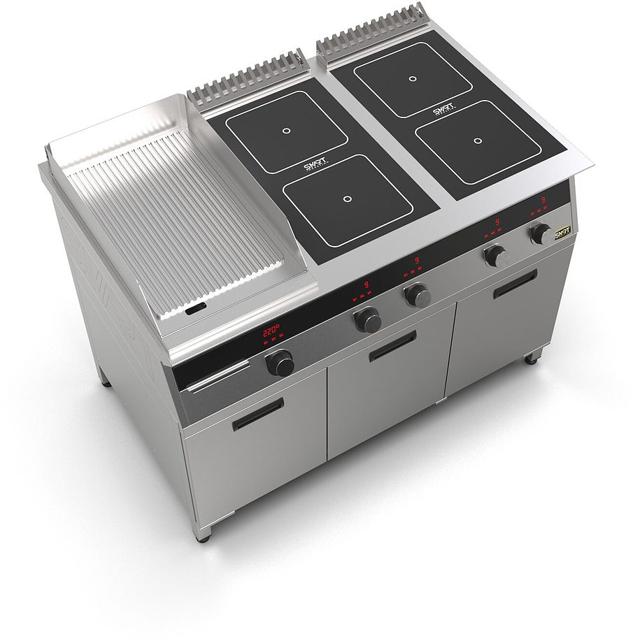Индукционная плита SMART INDUCTION K76-3RKN (с грилем) серии 700 используется на предприятиях общественного питания, торговли и пищевых производствах для приготовления и разогрева различных видов блюд в специализированной посуде. Модель оснащена электро-механическим управлением, сенсорными кнопками, индикаторами, 3 жировыми фильтрами съемным, 2 ящиками для сбора масла, жира и остатков пищи и регулируемыми ножками. Материал корпуса, столешницы и воздуховода - высококачественная нержавеющая сталь AISI 430, материал рабочей поверхности плиты - стеклокерамика, материал передней панели и поверхности гриля - нержавеющая сталь.