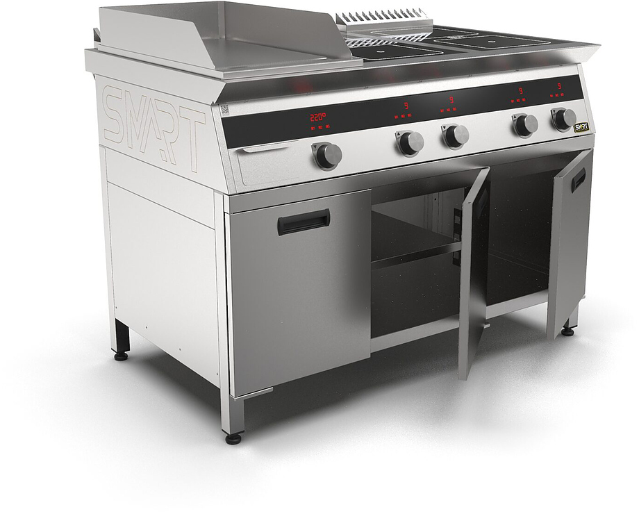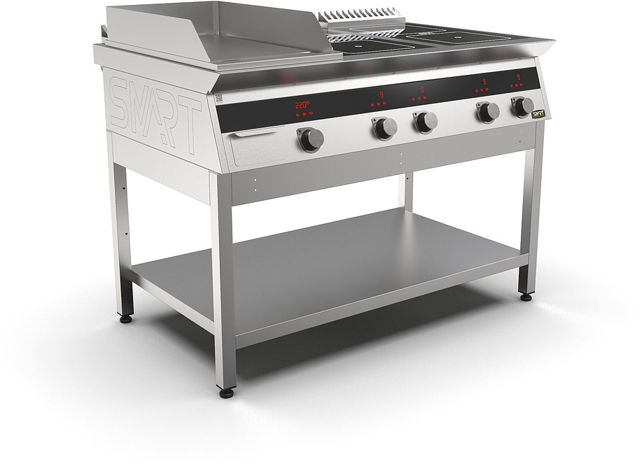 Индукционная плита SMART INDUCTION K96-3PKN (с грилем) серии 900 используется на предприятиях общественного питания, торговли и пищевых производствах для приготовления и разогрева различных видов блюд в специализированной посуде. Модель оснащена электро-механическим управлением, сенсорными кнопками, индикаторами, 3 жировыми фильтрами съемным, 2 ящиками для сбора масла, жира и остатков пищи и регулируемыми ножками. Материал корпуса, столешницы и воздуховода - высококачественная нержавеющая сталь AISI 430, материал рабочей поверхности плиты - стеклокерамика, материал передней панели и поверхности гриля - нержавеющая сталь.