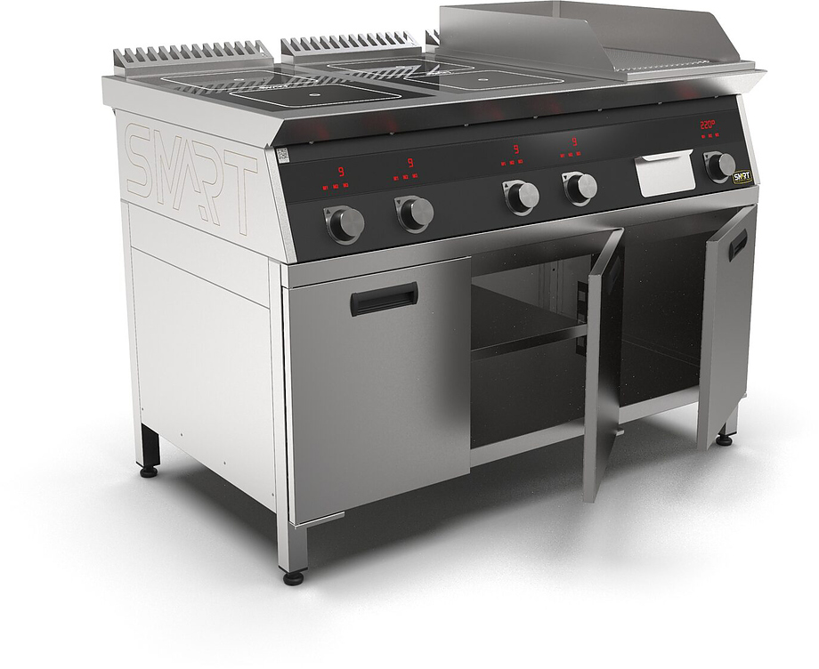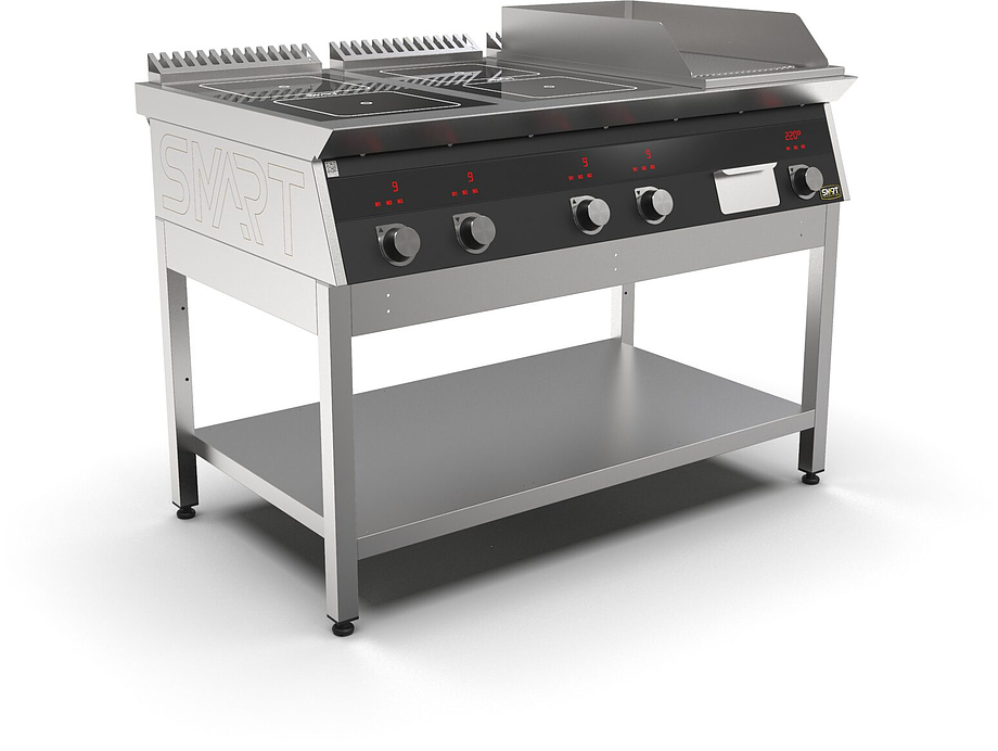 Индукционная плита SMART INDUCTION K76-5KPB (с грилем) серии 700 используется на предприятиях общественного питания, торговли и пищевых производствах для приготовления и разогрева различных видов блюд в специализированной посуде. Модель оснащена электро-механическим управлением, сенсорными кнопками, индикаторами, 3 жировыми фильтрами съемным, 2 ящиками для сбора масла, жира и остатков пищи и регулируемыми ножками. Материал корпуса, столешницы и воздуховода - высококачественная нержавеющая сталь AISI 430, материал поверхности гриля - нержавеющая сталь, материал рабочей поверхности плиты - стеклокерамика, материал передней панели - стойкое полимерное покрытие черного цвета.