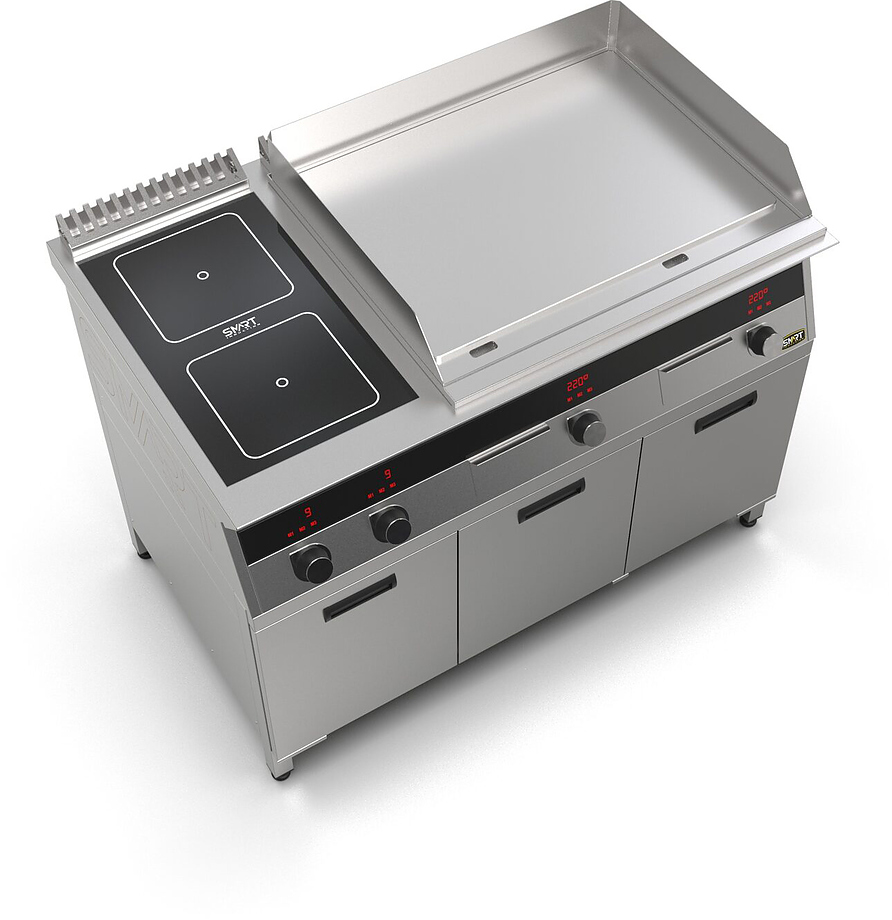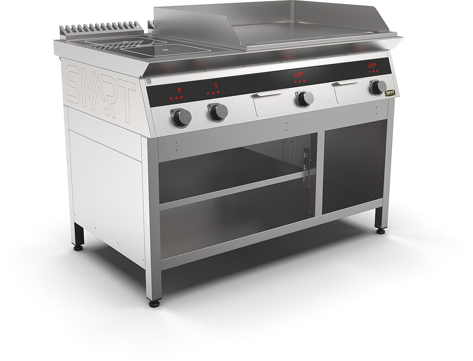 Индукционная плита SMART INDUCTION K96-3KPPN (с грилем) серии 900 используется на предприятиях общественного питания, торговли и пищевых производствах для приготовления и разогрева различных видов блюд в специализированной посуде. Модель оснащена электро-механическим управлением, сенсорными кнопками, индикаторами, 3 жировыми фильтрами съемным, 2 ящиками для сбора масла, жира и остатков пищи и регулируемыми ножками. Материал корпуса, столешницы и воздуховода - высококачественная нержавеющая сталь AISI 430, материал рабочей поверхности - стеклокерамика, материал поверхности гриля и передней панели - нержавеющая сталь.