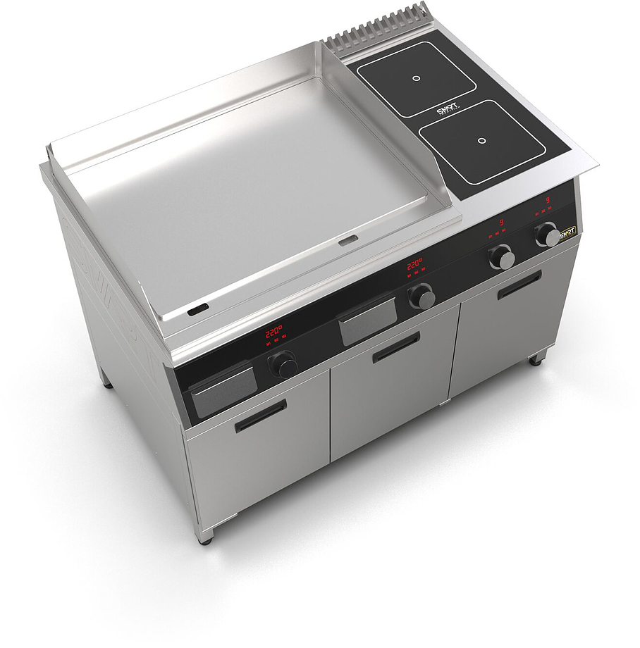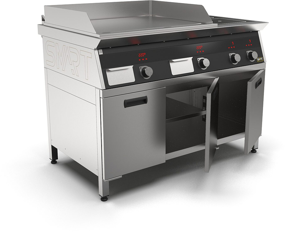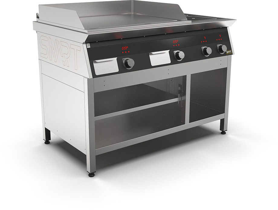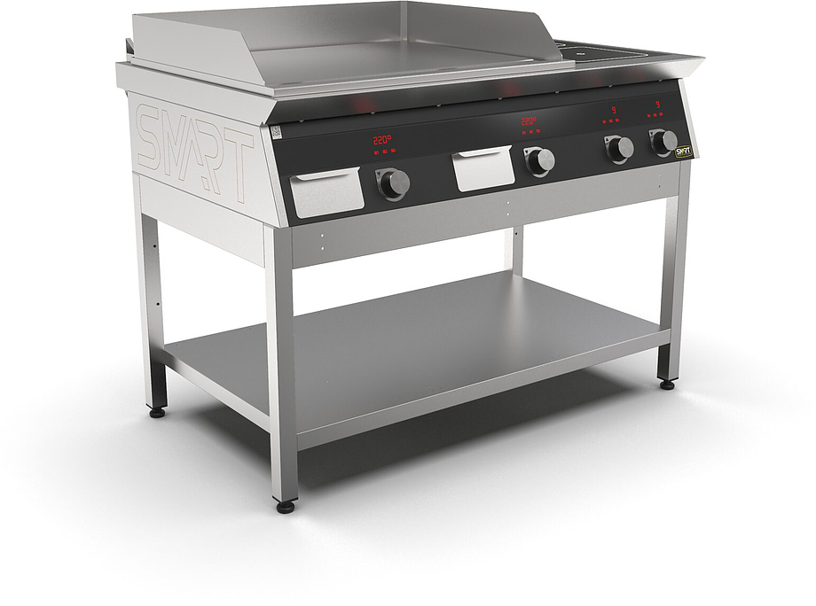Индукционная плита SMART INDUCTION K96-3PPKB (с грилем) серии 900 используется на предприятиях общественного питания, торговли и пищевых производствах для приготовления и разогрева различных видов блюд в специализированной посуде. Модель оснащена электро-механическим управлением, сенсорными кнопками, индикаторами, 3 жировыми фильтрами съемным, 2 ящиками для сбора масла, жира и остатков пищи и регулируемыми ножками. Материал корпуса, столешницы и воздуховода - высококачественная нержавеющая сталь AISI 430, материал рабочей поверхности - стеклокерамика, материал поверхности гриля - нержавеющая сталь, материал передней панели - стойкое полимерное покрытие черного цвета.