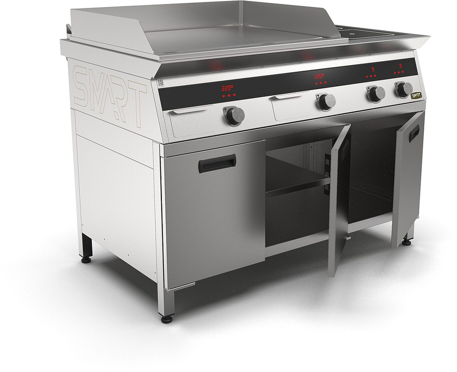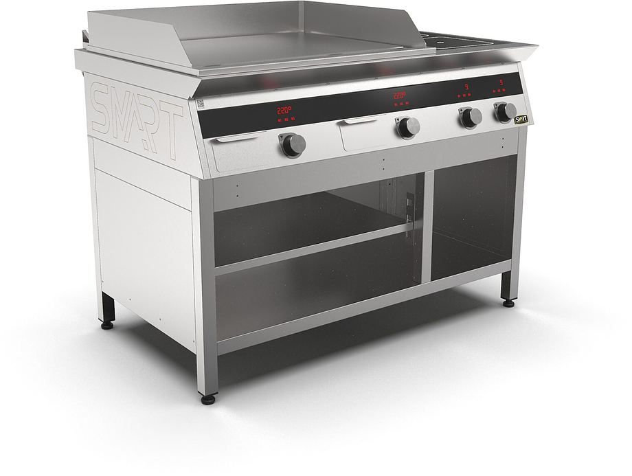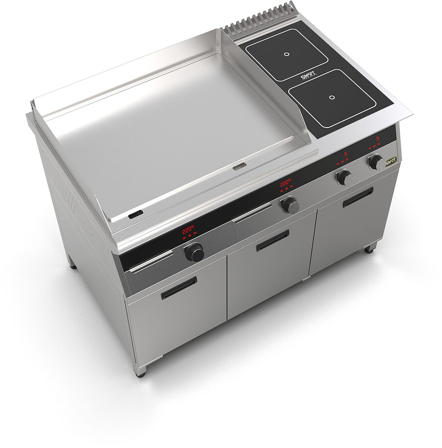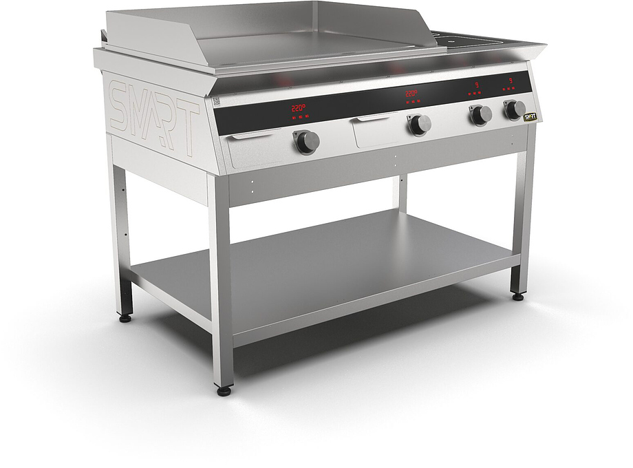 Индукционная плита SMART INDUCTION K96-3PPKN (с грилем) серии 900 используется на предприятиях общественного питания, торговли и пищевых производствах для приготовления и разогрева различных видов блюд в специализированной посуде. Модель оснащена электро-механическим управлением, сенсорными кнопками, индикаторами, 3 жировыми фильтрами съемным, 2 ящиками для сбора масла, жира и остатков пищи и регулируемыми ножками. Материал корпуса, столешницы и воздуховода - высококачественная нержавеющая сталь AISI 430, материал рабочей поверхности - стеклокерамика, материал поверхности гриля и передней панели - нержавеющая сталь.