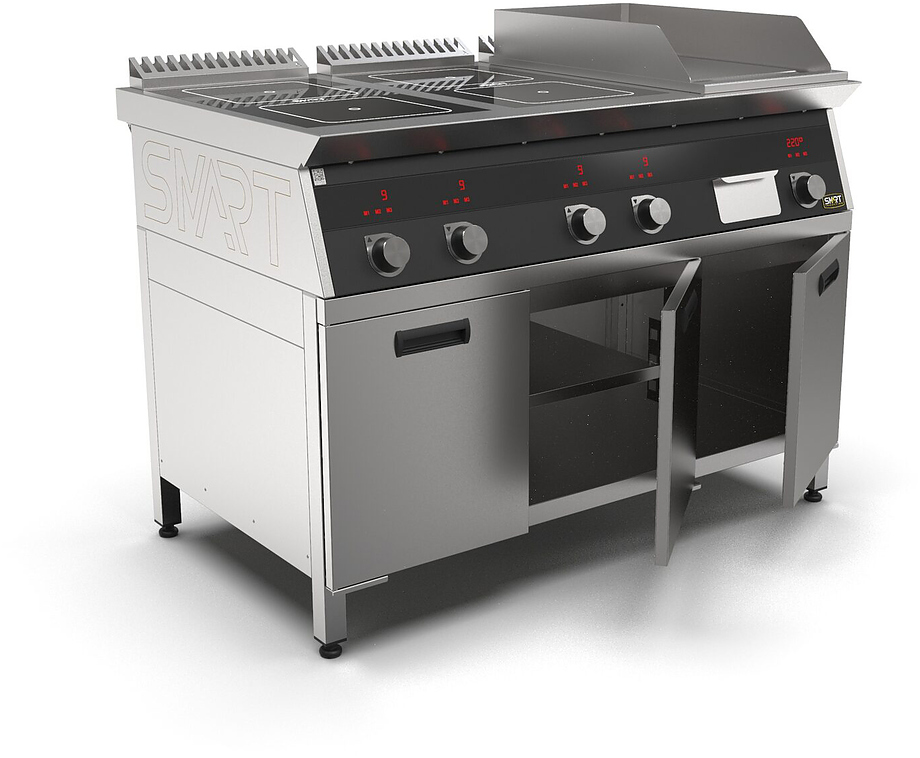Индукционная плита SMART INDUCTION K96-5KPB (с грилем) серии 900 используется на предприятиях общественного питания, торговли и пищевых производствах для приготовления и разогрева различных видов блюд в специализированной посуде. Модель оснащена электро-механическим управлением, сенсорными кнопками, индикаторами, 3 жировыми фильтрами съемным, 2 ящиками для сбора масла, жира и остатков пищи и регулируемыми ножками. Материал корпуса, столешницы и воздуховода - высококачественная нержавеющая сталь AISI 430, материал поверхности гриля - нержавеющая сталь, материал рабочей поверхности плиты - стеклокерамика, материал передней панели - стойкое полимерное покрытие черного цвета.