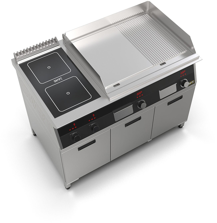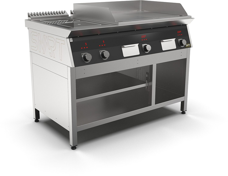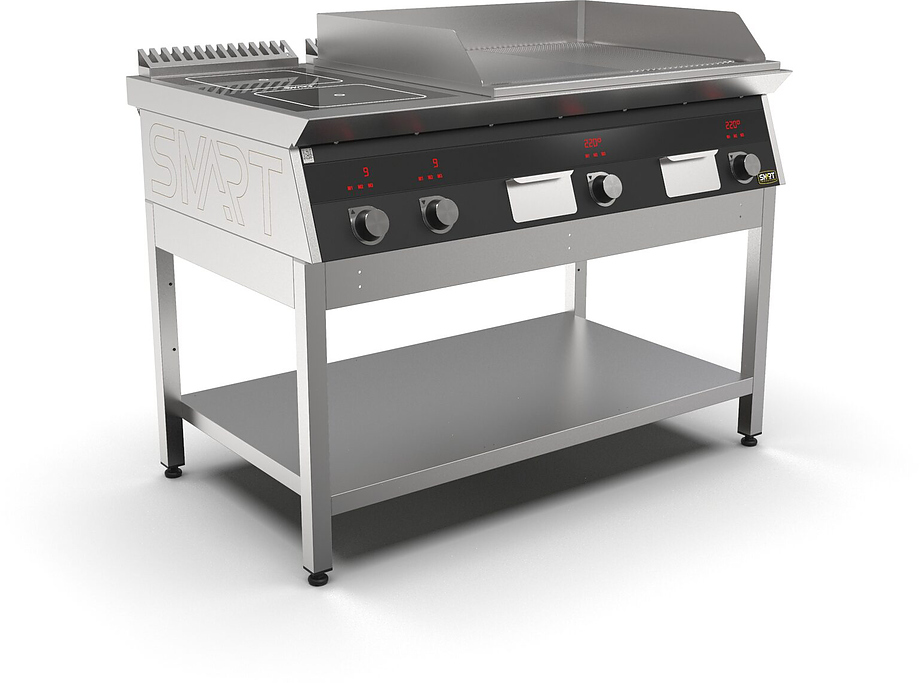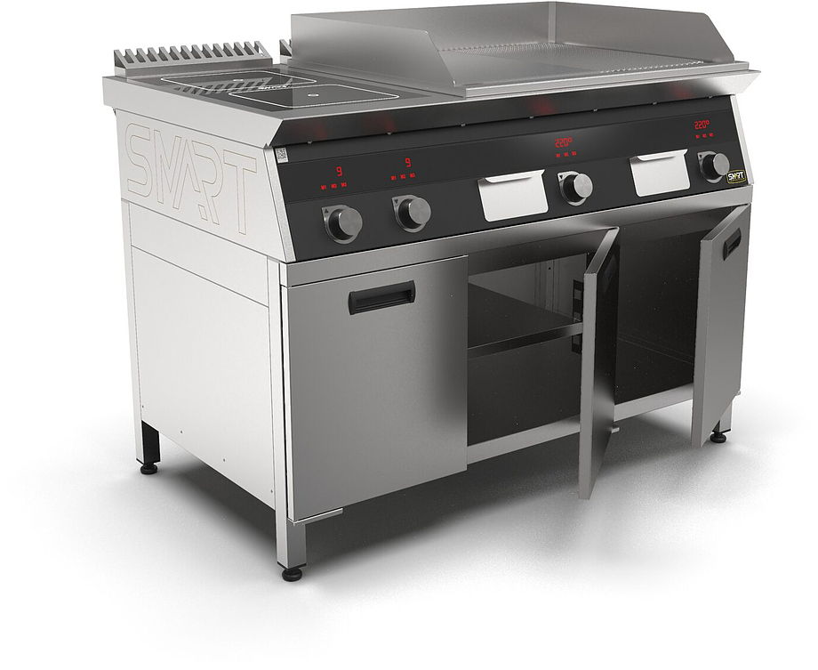Индукционная плита SMART INDUCTION K96-35KPRB (с грилем) серии 900 используется на предприятиях общественного питания, торговли и пищевых производствах для приготовления и разогрева различных видов блюд в специализированной посуде. Модель оснащена электро-механическим управлением, сенсорными кнопками, индикаторами, 3 жировыми фильтрами съемным, 2 ящиками для сбора масла, жира и остатков пищи и регулируемыми ножками. Материал корпуса, столешницы и воздуховода - высококачественная нержавеющая сталь AISI 430, материал рабочей поверхности - стеклокерамика, материал поверхности гриля - нержавеющая сталь, материал передней панели - стойкое полимерное покрытие черного цвета.