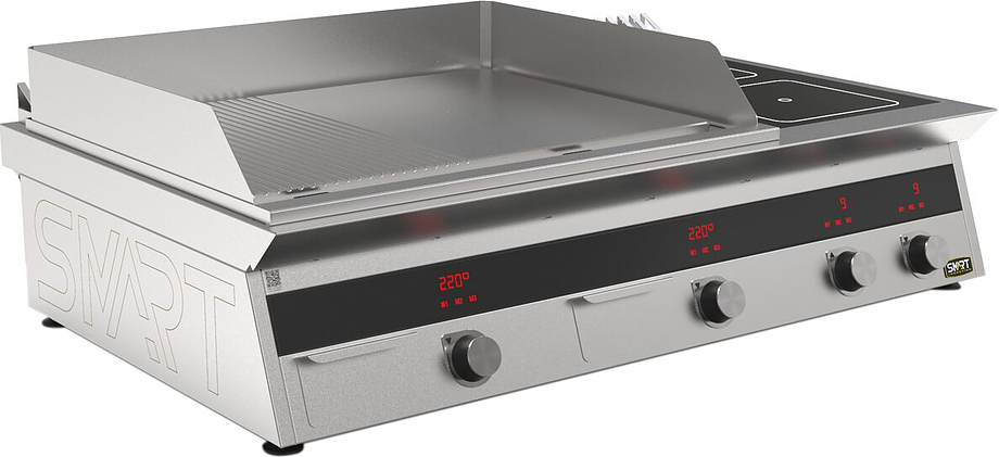 Индукционная плита SMART INDUCTION K96-35RPKN (с грилем) серии 900 используется на предприятиях общественного питания, торговли и пищевых производствах для приготовления и разогрева различных видов блюд в специализированной посуде. Модель оснащена электро-механическим управлением, сенсорными кнопками, индикаторами, 3 жировыми фильтрами съемным, 2 ящиками для сбора масла, жира и остатков пищи и регулируемыми ножками. Материал корпуса, столешницы и воздуховода - высококачественная нержавеющая сталь AISI 430, материал рабочей поверхности - стеклокерамика, материал поверхности гриля и передней панели - нержавеющая сталь.