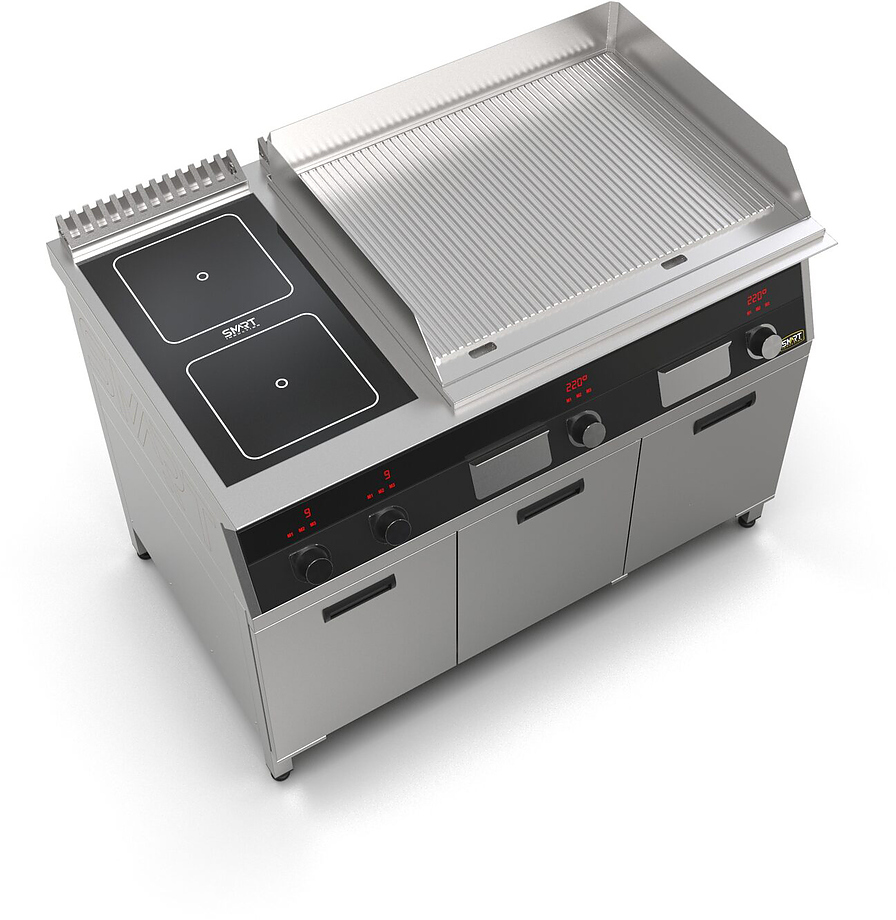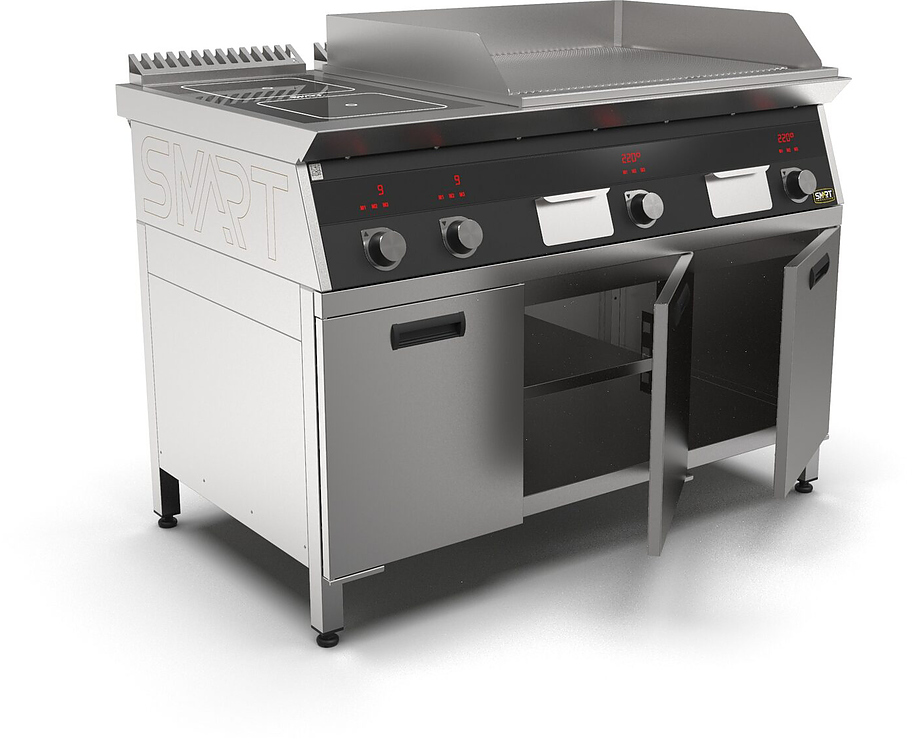 Индукционная плита SMART INDUCTION K96-3KRRB (с грилем) серии 900 используется на предприятиях общественного питания, торговли и пищевых производствах для приготовления и разогрева различных видов блюд в специализированной посуде. Модель оснащена электро-механическим управлением, сенсорными кнопками, индикаторами, 3 жировыми фильтрами съемным, 2 ящиками для сбора масла, жира и остатков пищи и регулируемыми ножками. Материал корпуса, столешницы и воздуховода - высококачественная нержавеющая сталь AISI 430, материал рабочей поверхности - стеклокерамика, материал поверхности гриля - нержавеющая сталь, материал передней панели - стойкое полимерное покрытие черного цвета.