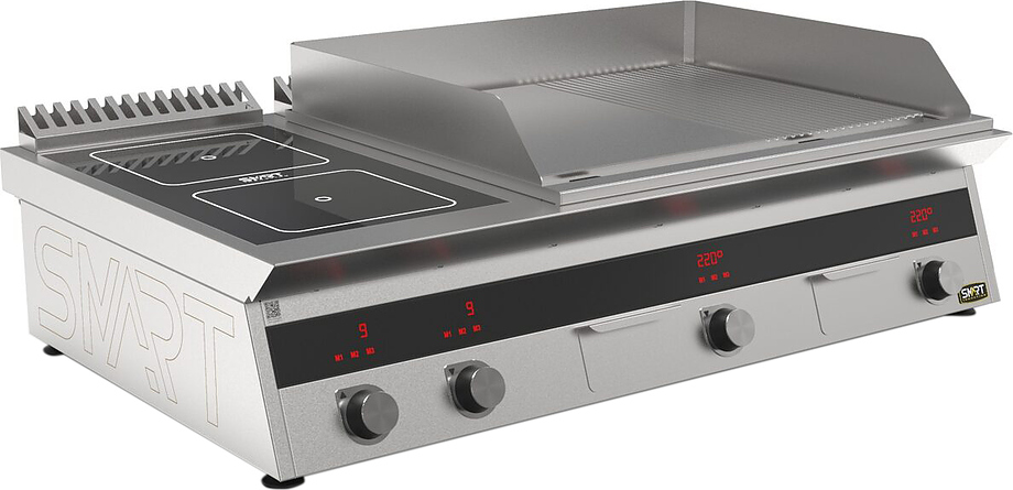 Индукционная плита SMART INDUCTION K96-5KPRN (с грилем) серии 900 используется на предприятиях общественного питания, торговли и пищевых производствах для приготовления и разогрева различных видов блюд в специализированной посуде. Модель оснащена электро-механическим управлением, сенсорными кнопками, индикаторами, 3 жировыми фильтрами съемным, 2 ящиками для сбора масла, жира и остатков пищи и регулируемыми ножками. Материал корпуса, столешницы и воздуховода - высококачественная нержавеющая сталь AISI 430, материал рабочей поверхности - стеклокерамика, материал поверхности гриля и передней панели - нержавеющая сталь.