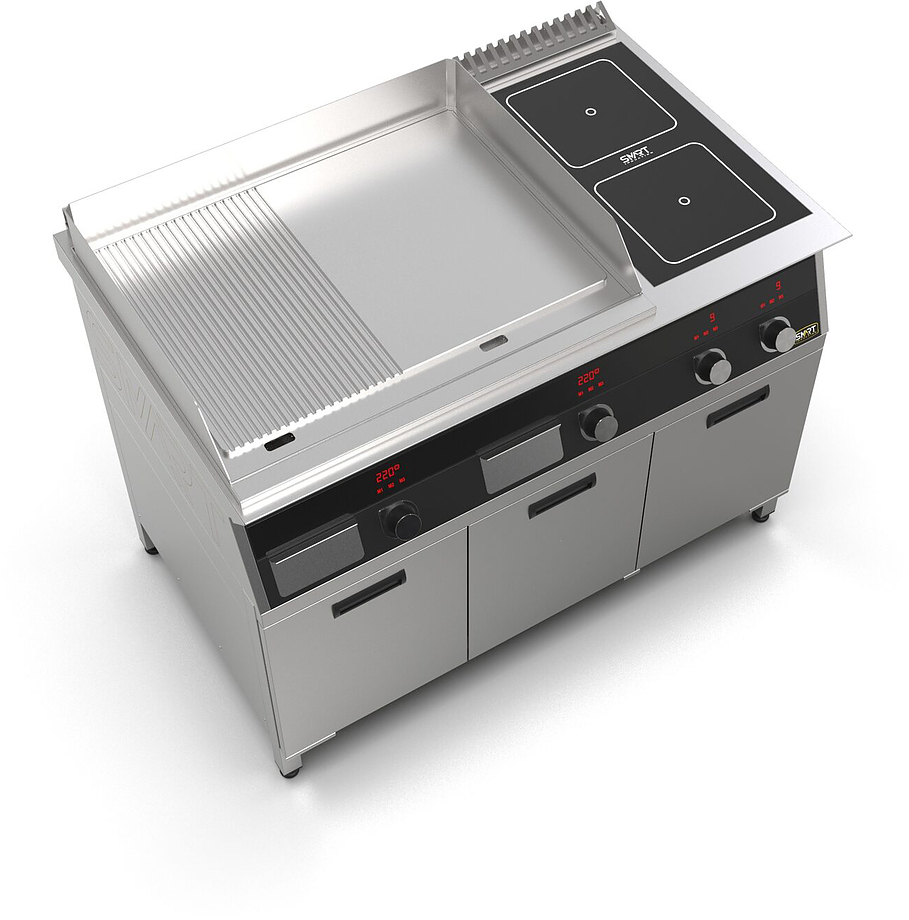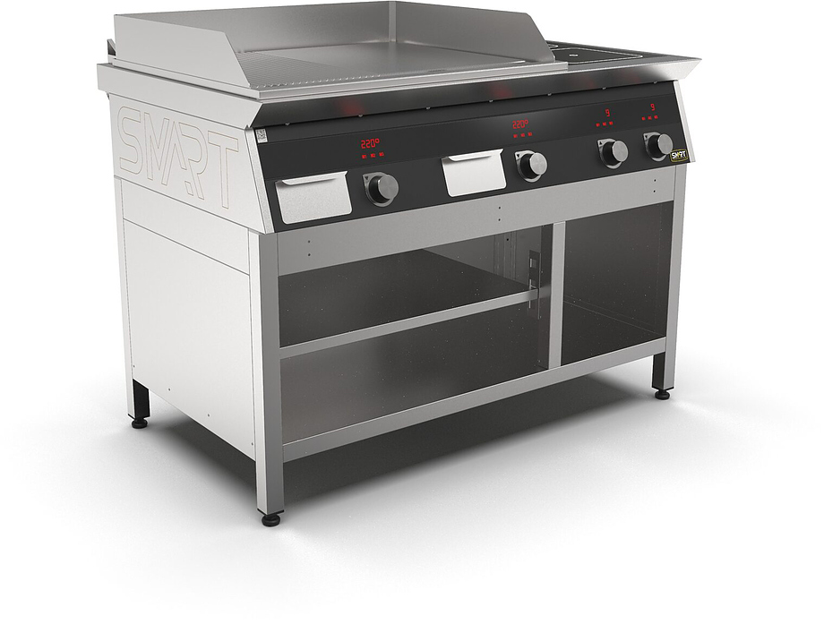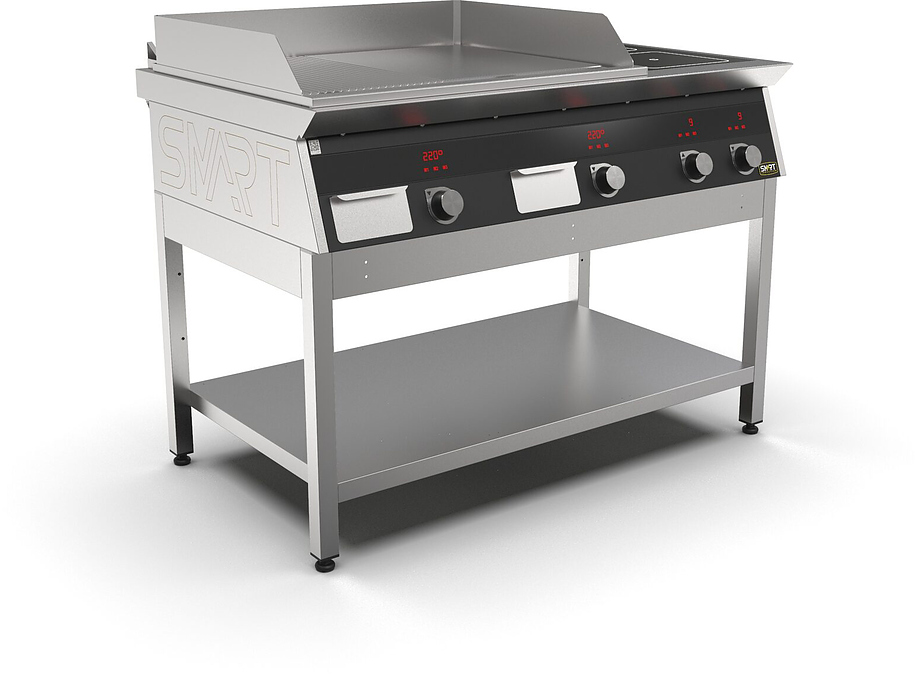Индукционная плита SMART INDUCTION K96-5RPKB (с грилем) серии 900 используется на предприятиях общественного питания, торговли и пищевых производствах для приготовления и разогрева различных видов блюд в специализированной посуде. Модель оснащена электро-механическим управлением, сенсорными кнопками, индикаторами, 3 жировыми фильтрами съемным, 2 ящиками для сбора масла, жира и остатков пищи и регулируемыми ножками. Материал корпуса, столешницы и воздуховода - высококачественная нержавеющая сталь AISI 430, материал рабочей поверхности - стеклокерамика, материал поверхности гриля - нержавеющая сталь, материал передней панели - стойкое полимерное покрытие черного цвета.