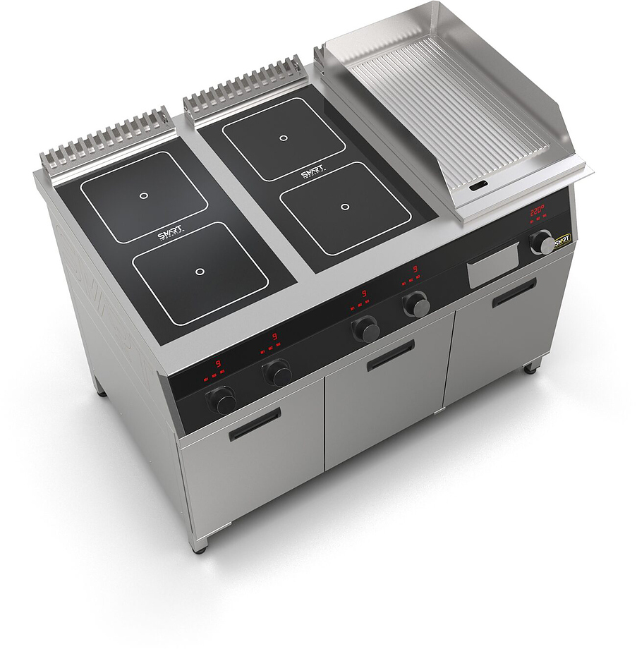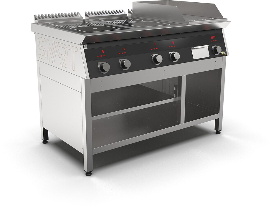 Индукционная плита SMART INDUCTION K96-5KRB (с грилем) серии 900 используется на предприятиях общественного питания, торговли и пищевых производствах для приготовления и разогрева различных видов блюд в специализированной посуде. Модель оснащена электро-механическим управлением, сенсорными кнопками, индикаторами, 3 жировыми фильтрами съемным, 2 ящиками для сбора масла, жира и остатков пищи и регулируемыми ножками. Материал корпуса, столешницы и воздуховода - высококачественная нержавеющая сталь AISI 430, материал поверхности гриля - нержавеющая сталь, материал рабочей поверхности плиты - стеклокерамика, материал передней панели - стойкое полимерное покрытие черного цвета.