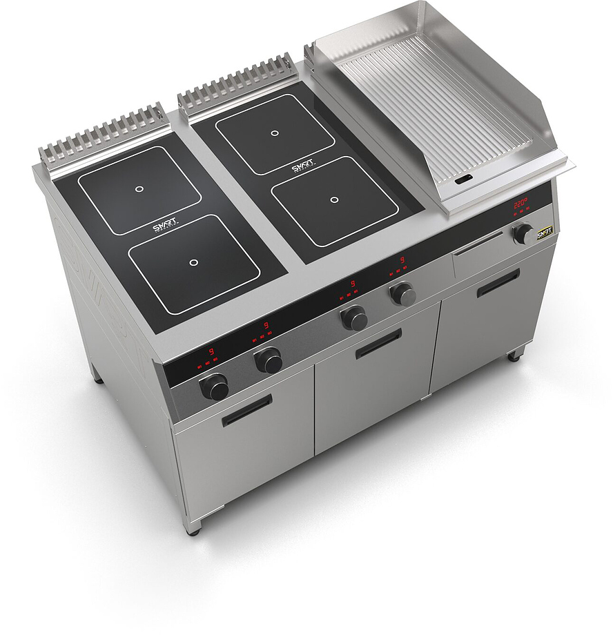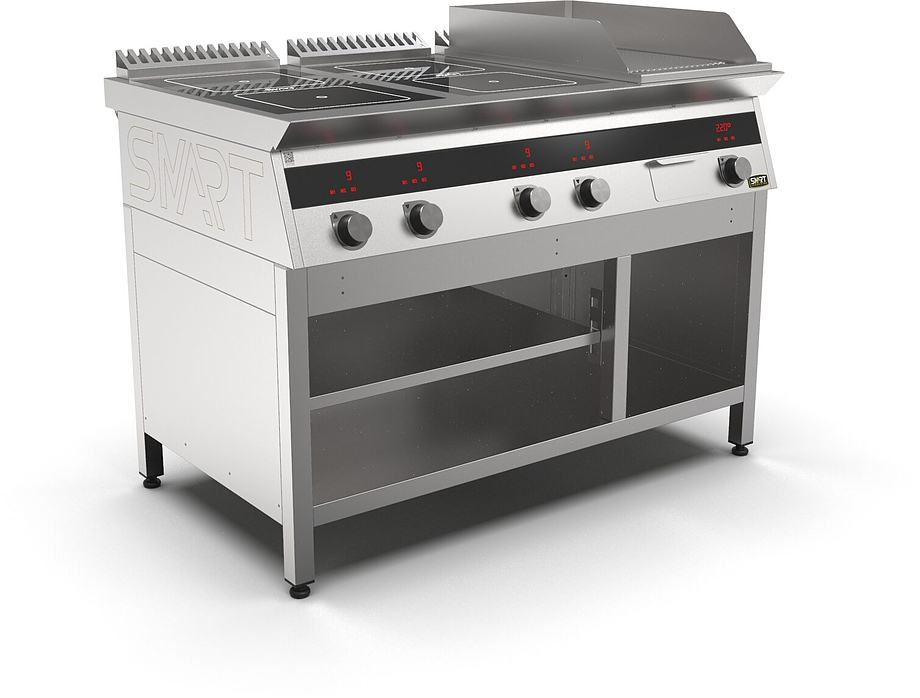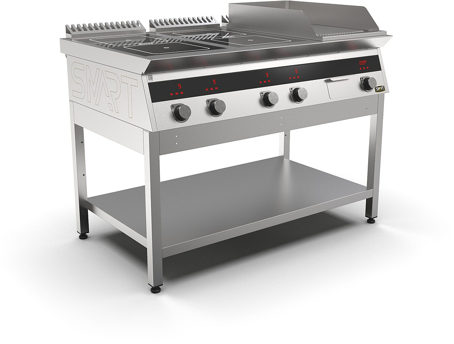 Индукционная плита SMART INDUCTION K96-5KRN (с грилем) серии 900 используется на предприятиях общественного питания, торговли и пищевых производствах для приготовления и разогрева различных видов блюд в специализированной посуде. Модель оснащена электро-механическим управлением, сенсорными кнопками, индикаторами, 3 жировыми фильтрами съемным, 2 ящиками для сбора масла, жира и остатков пищи и регулируемыми ножками. Материал корпуса, столешницы и воздуховода - высококачественная нержавеющая сталь AISI 430, материал поверхности гриля и передней панели - нержавеющая сталь, материал рабочей поверхности плиты - стеклокерамика.