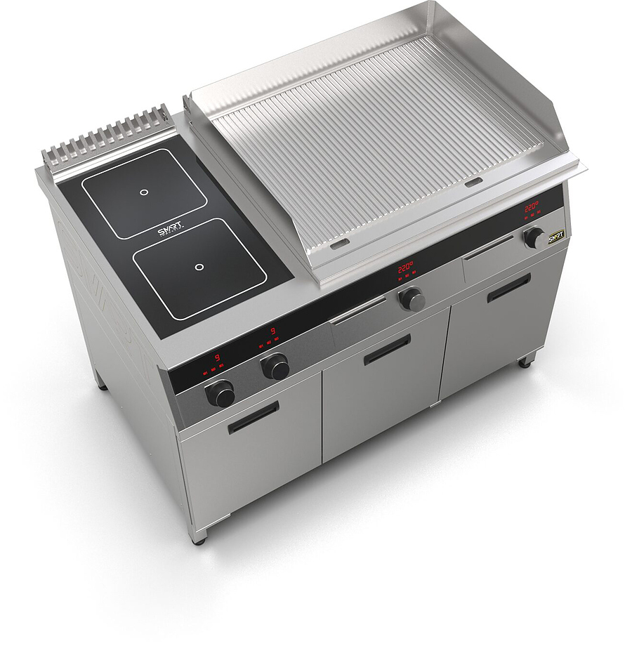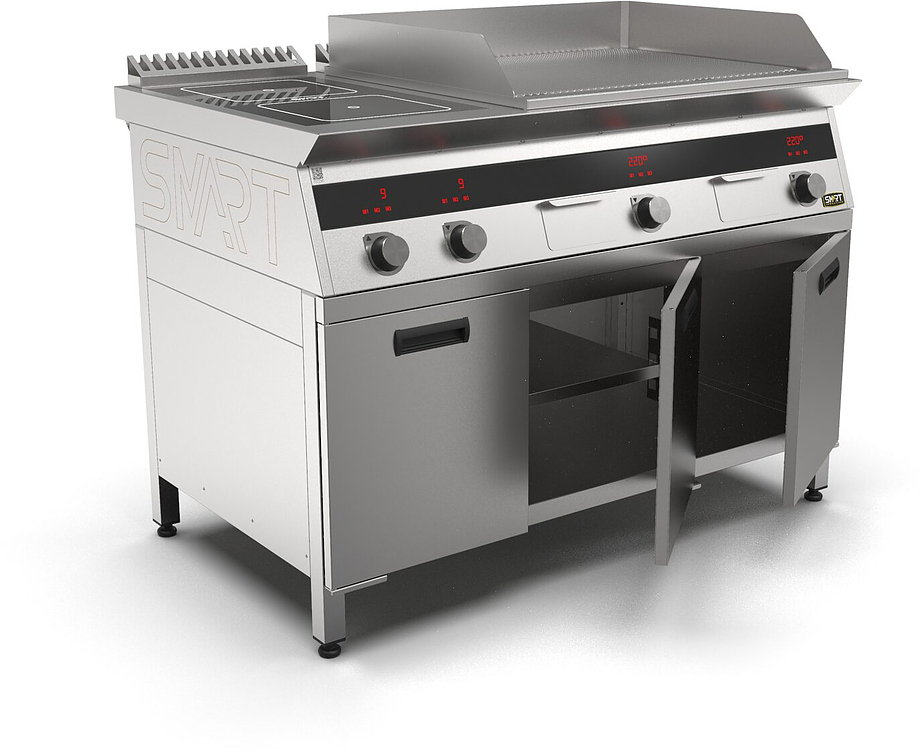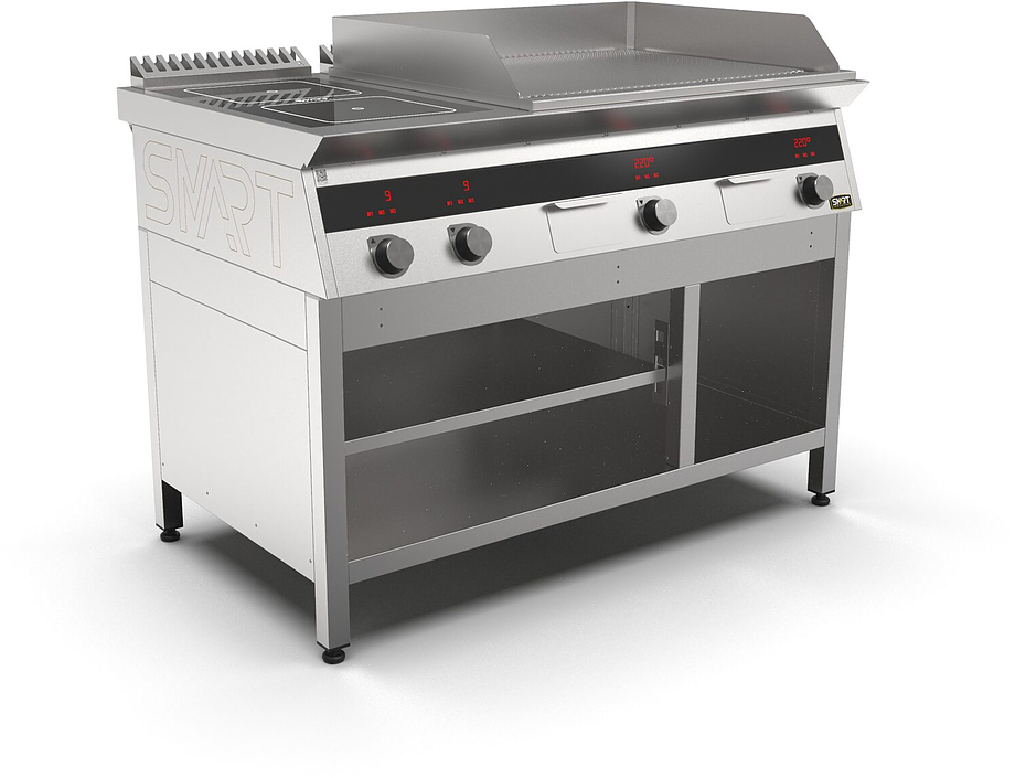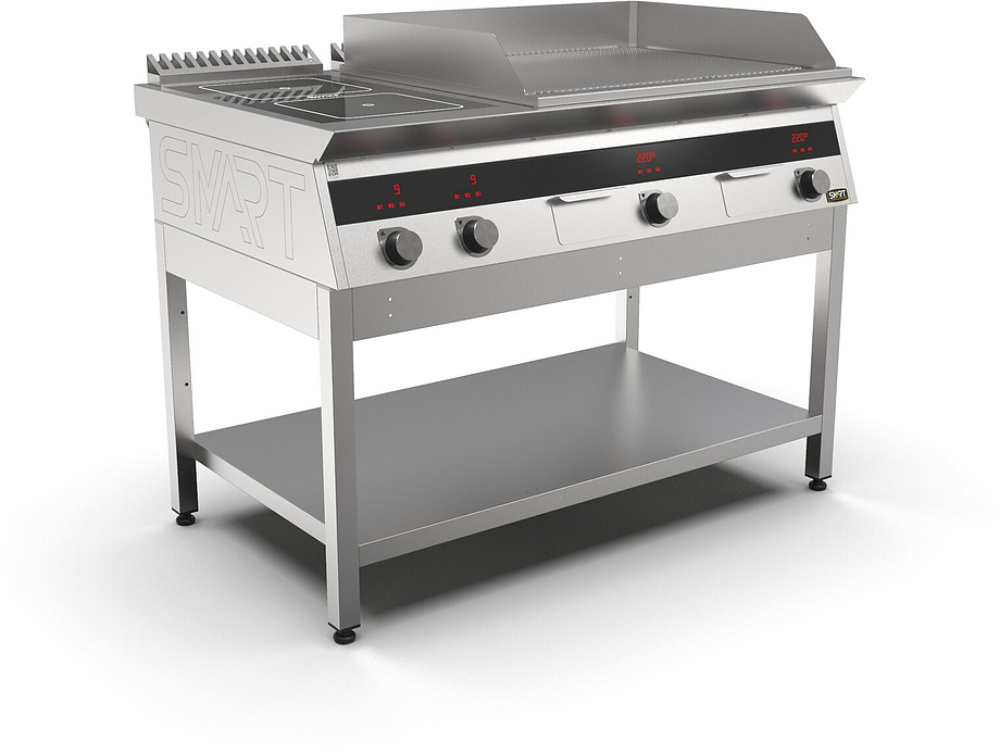 Индукционная плита SMART INDUCTION K96-5KRRN (с грилем) серии 900 используется на предприятиях общественного питания, торговли и пищевых производствах для приготовления и разогрева различных видов блюд в специализированной посуде. Модель оснащена электро-механическим управлением, сенсорными кнопками, индикаторами, 3 жировыми фильтрами съемным, 2 ящиками для сбора масла, жира и остатков пищи и регулируемыми ножками. Материал корпуса, столешницы и воздуховода - высококачественная нержавеющая сталь AISI 430, материал рабочей поверхности - стеклокерамика, материал поверхности гриля и передней панели - нержавеющая сталь.