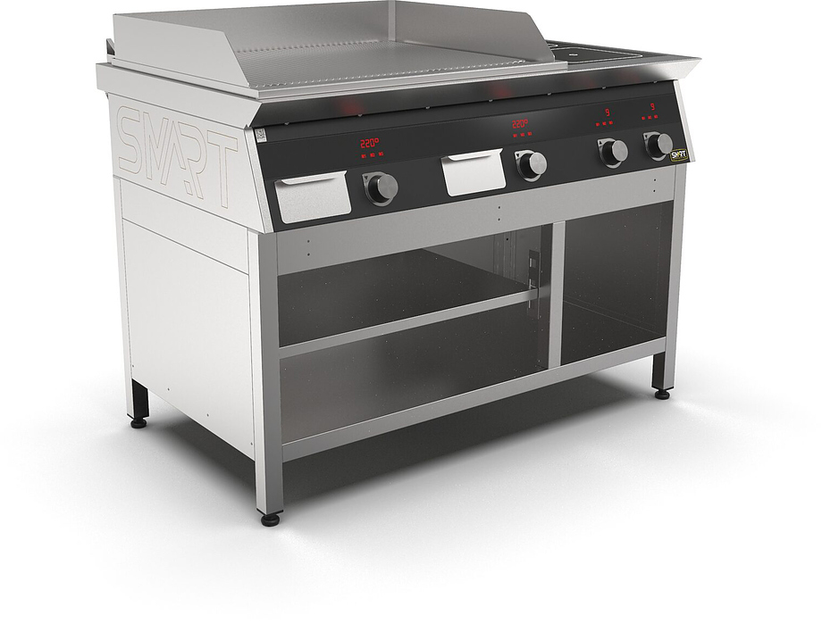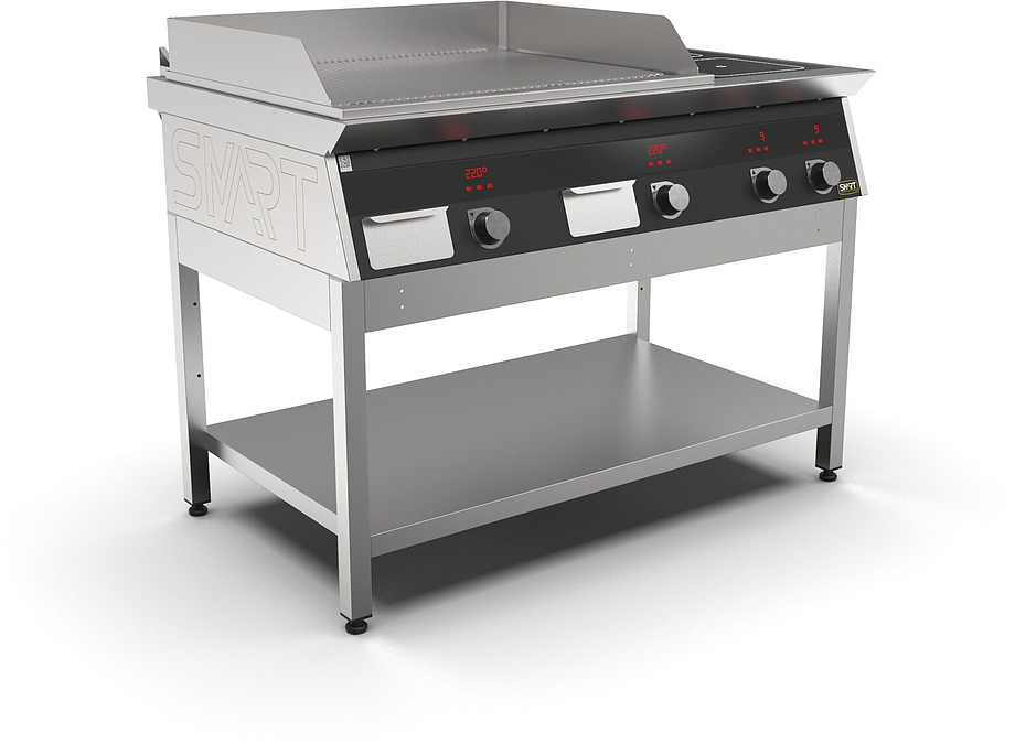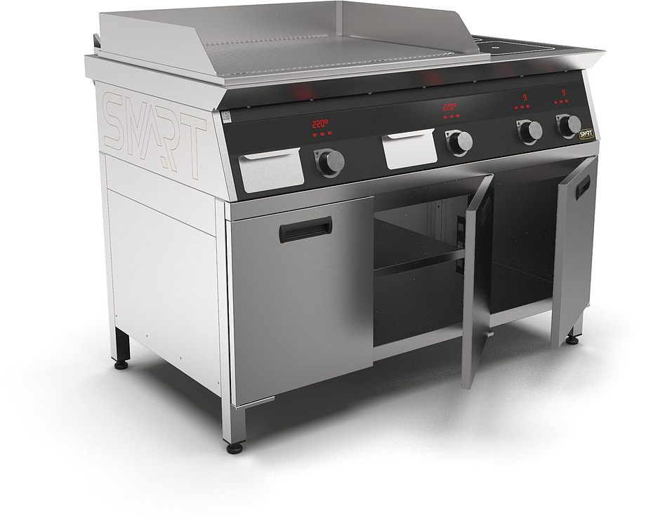 Индукционная плита SMART INDUCTION K96-5RRKB (с грилем) серии 900 используется на предприятиях общественного питания, торговли и пищевых производствах для приготовления и разогрева различных видов блюд в специализированной посуде. Модель оснащена электро-механическим управлением, сенсорными кнопками, индикаторами, 3 жировыми фильтрами съемным, 2 ящиками для сбора масла, жира и остатков пищи и регулируемыми ножками. Материал корпуса, столешницы и воздуховода - высококачественная нержавеющая сталь AISI 430, материал рабочей поверхности - стеклокерамика, материал поверхности гриля - нержавеющая сталь, материал передней панели - стойкое полимерное покрытие черного цвета.