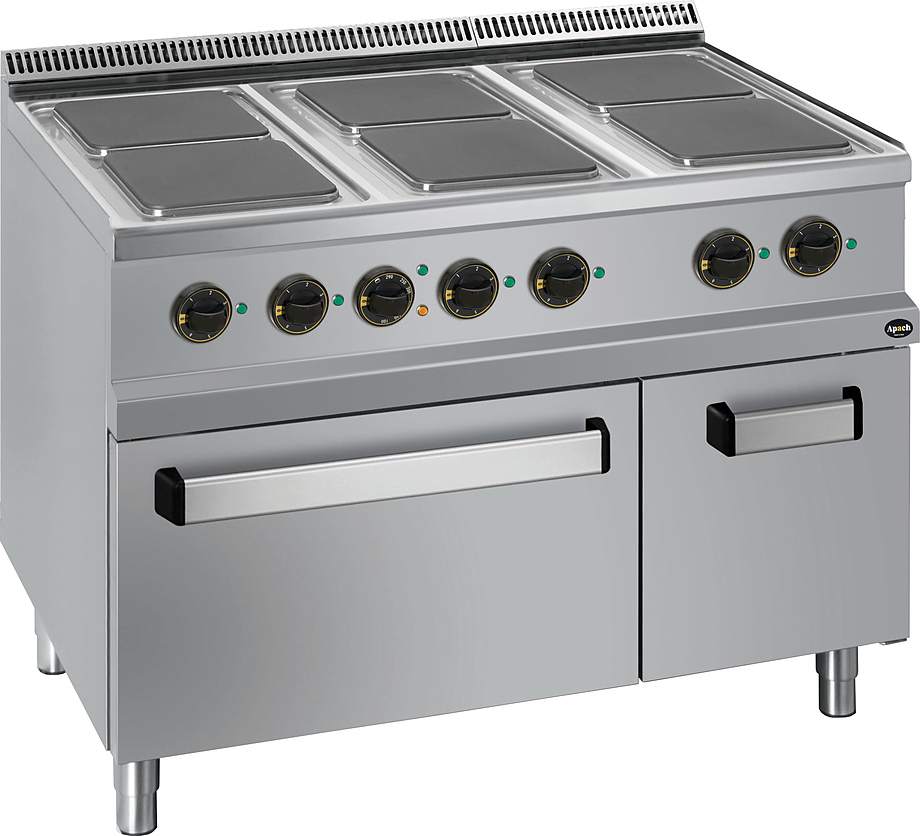 Электрическая плита Apach APRE-117FE/PL 700-й серии предназначена для приготовления различных блюд из мяса, птицы, рыбы и овощей в наплитной посуде на предприятиях общественного питания и торговли. Модель оснащена электромеханической панелью управления, быстро нагревающимися конфорками, гидроизолированной прессованной поверхностью и регулируемыми по высоте ножками. Корпус, рабочая поверхность, панель управления и вытяжная решетка выполнены из нержавеющей стали AISI 304, боковые и задняя панели - из нержавеющей стали AISI 430.