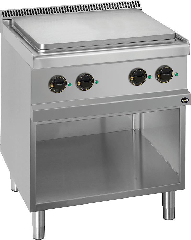 Электрическая плита Apach APRES-77P/PL 700-й серии предназначена для приготовления различных блюд из мяса, птицы, рыбы и овощей в наплитной посуде на предприятиях общественного питания и торговли. Модель оснащена электромеханической панелью управления и открытой подставкой с регулируемыми по высоте ножками. Температура рабочей поверхности в центре достигает 450 °C и уменьшается к краям до 200 °C. Корпус, рабочая поверхность, панель управления и вытяжная решетка выполнены из нержавеющей стали AISI 304, боковые и задняя панели - из нержавеющей стали AISI 430, жарочная поверхность - из легированной стали.