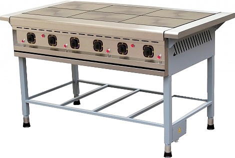 Электрическая плита ONEGA ПЭ-6 Н предназначена для приготовления различных блюд на предприятиях общественного питания, торговли и пищевых производствах. Модель оснащена электромеханическим управлением и стендом. Материал лицевой панели и корпуса - высококачественная нержавеющая сталь, материал задней стенки - оцинкованная сталь, материал подставки - сталь с антикоррозийным покрытием, материал рабочей поверхности - чугун.