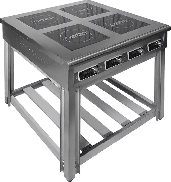 Индукционная плита OBOD ИП-004 предназначена для приготовления широкого спектра блюд в наплитной посуде на предприятиях общественного питания, торговли и пищевых производствах. Плита оснащена 4 независимыми варочными зонами, открытой подставкой и электромеханической панелью управления. Материал корпуса - нержавеющая сталь, материал рабочей поверхности - стеклокерамика.