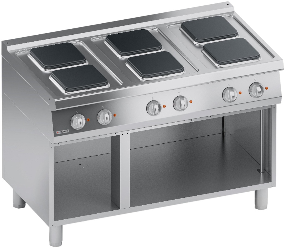 Плита Veroterm VT7CUE15VVQ серии 700 используется на предприятиях общественного питания, торговли и пищевых производствах для приготовления различных блюд. Модель с электромеханическим управлением и открытым шкафом для хранения кухонного инвентаря. Материал изделия - высококачественная нержавеющая сталь.