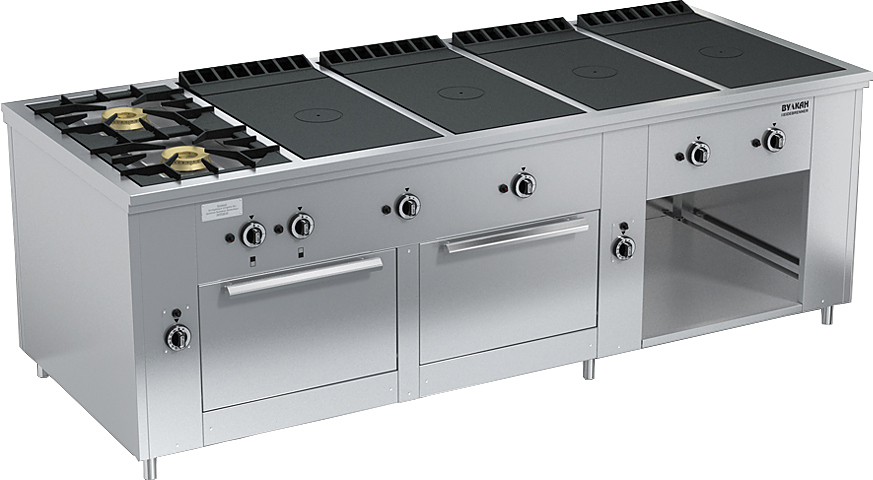 Газовая плита Вулкан ПРГ-IIA-10-4 2ДШ Maxi предназначена для приготовления первых, вторых и третьих блюд в наплитной посуде, выпечки хлебобулочных и кондитерских изделий на предприятиях общественного питания и торговли. Модель оснащена 2 секционными и 4 сплошными горелками, 2 духовыми шкафами, газ-контролем, пьезорозжигом и запальной горелкой. Корпус выполнен из нержавеющей стали.