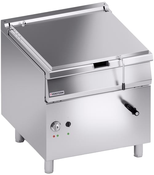 Опрокидывающая сковорода Veroterm VT4BREP10MA серии 900 используется на предприятии общественного питания, торговли и пищевых производствах для жарки, тушения, пассерования, припускания овощей, мяса, рыбы и других продуктов питания. Модель оснащена механическим управлением, ручным приводом, индикаторами, регулятором температуры и ножками. Материал изделия - высококачественная нержавеющая сталь AISI 430 (толщина 1 мм).