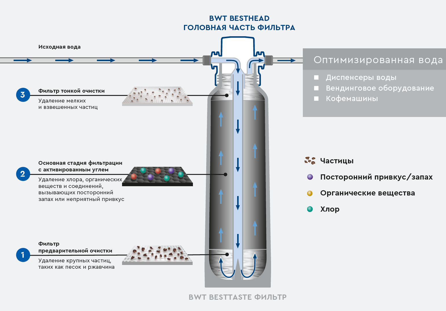 - Основная ступень фильтрации с активированным углем для удаления хлора, привкуса, запаха и органики